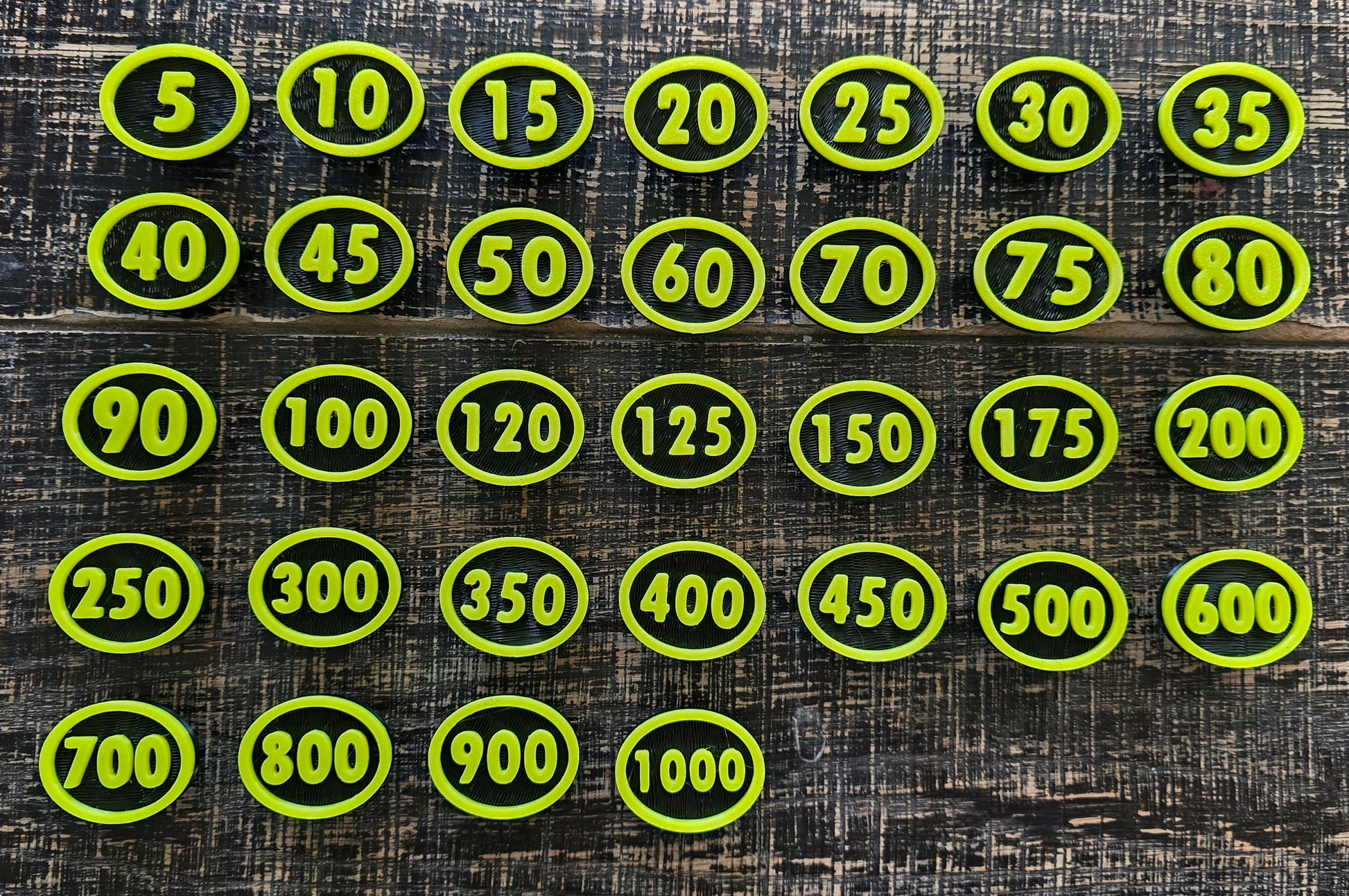 32 unique prices. Round pegs fit most frag racks. Clear, fluorescent numbers with a ring around the whole plug for easy visibility. Plug numbers are between $5 - $1000, see picture for all of the numbers.